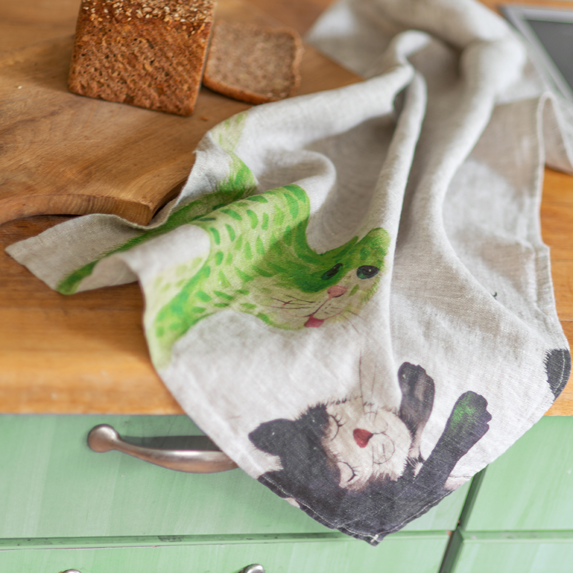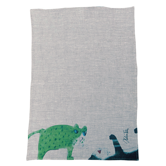 Helina Tilk: Geschirrtuch aus Leinen 70x50 Katze mit Tasse natur
