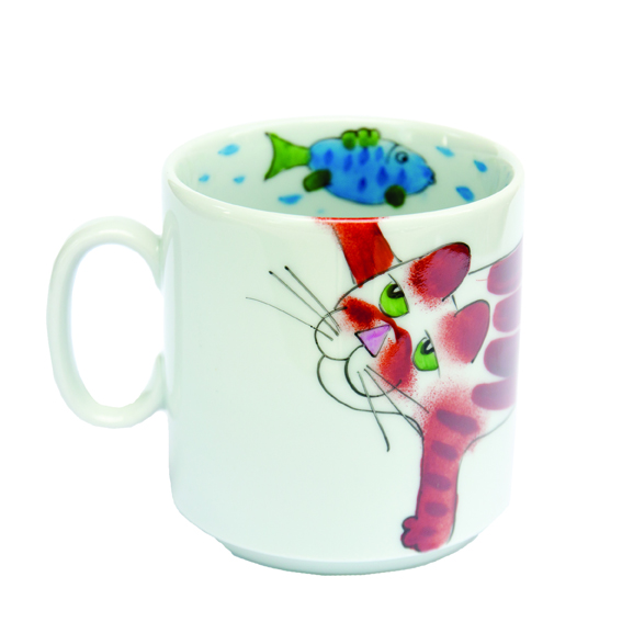 Details: handbemalter Henkelbecher Katze mit Fischmotiv