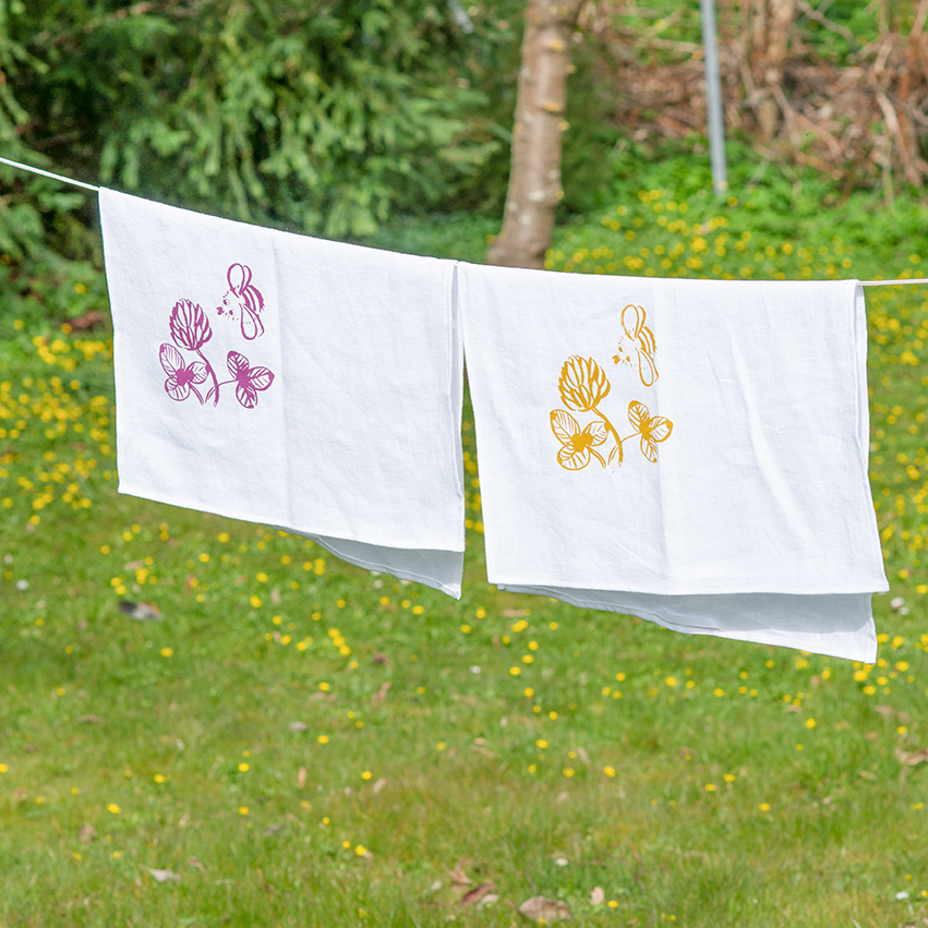 Handtuch 50 x 70 Wiesenklee mit Biene, gelb. Stonewashed Leinen. Siebdruck. Preis: 18,00 €