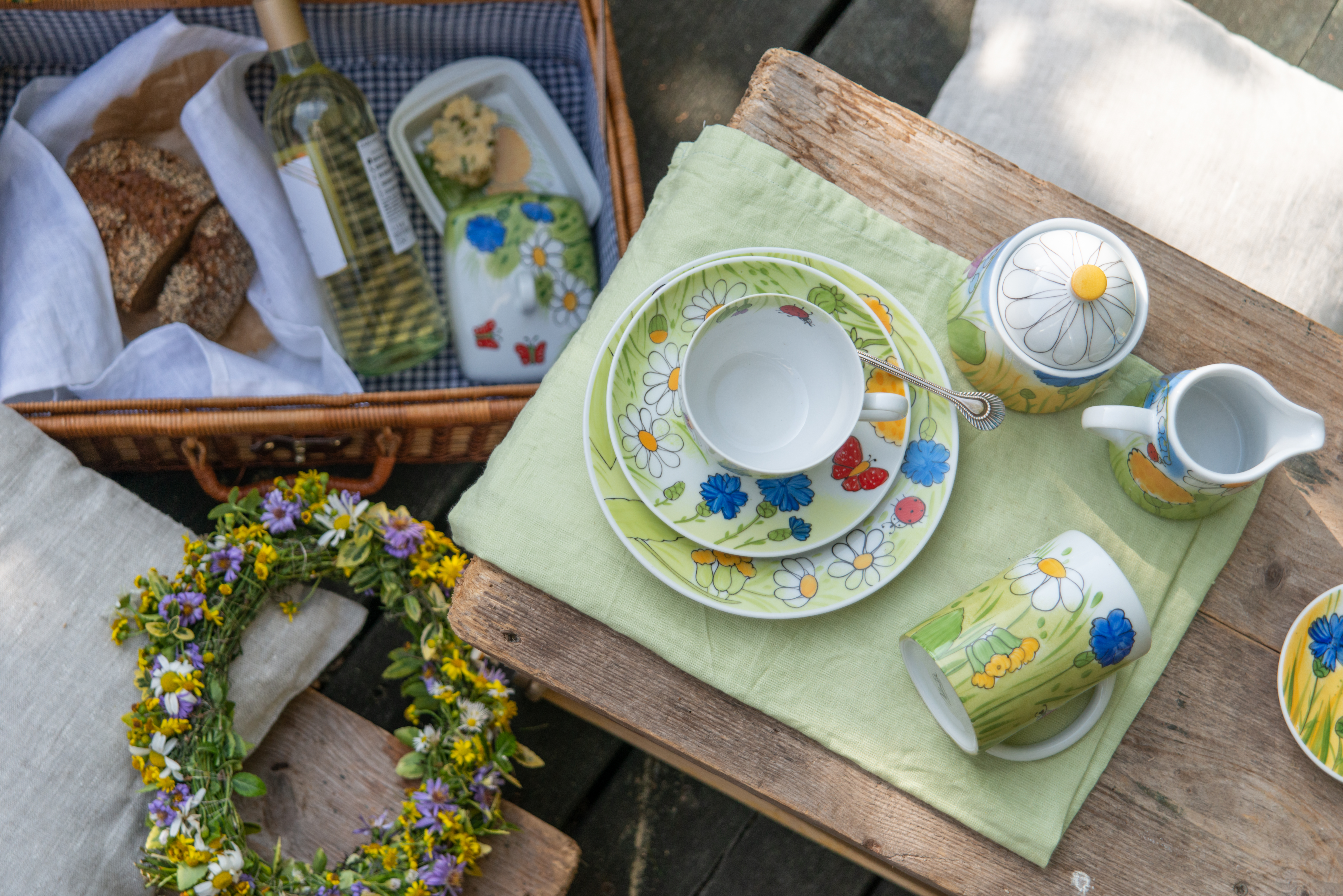 Es ist die Zeit des Lichts, des Lebens und der Farbe. Im Zentrum des Dekors stehen blaue Kornblumen und rote Schmetterlinge, die durch ihre Farbintensität bestechen. Das Service aus der Serie „Alle Blumen“ besteht aus einem großen Teller, einer großen Tasse samt Untertasse, einem Milchkännchen und einer Zuckerdose und lädt geradezu zum Picknicken ein. Besonderes Highlight ist die Butterdose mit zwei roten Schmetterlingen auf dem Deckel. Macht man sie auf, entdeckt man die zwei versteckten Butterblumen auf dem Boden. Dieser estnische Blumenzauber erfreut das Herz.