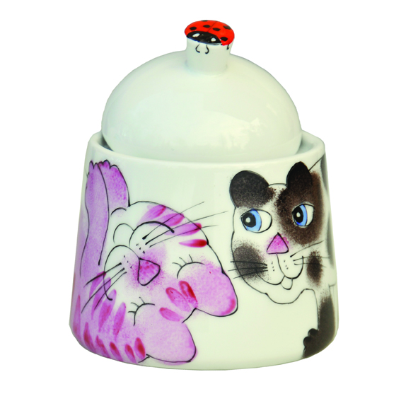 Details: handbemalte Zuckerdose runde Form rosa mit Katzenmotiv