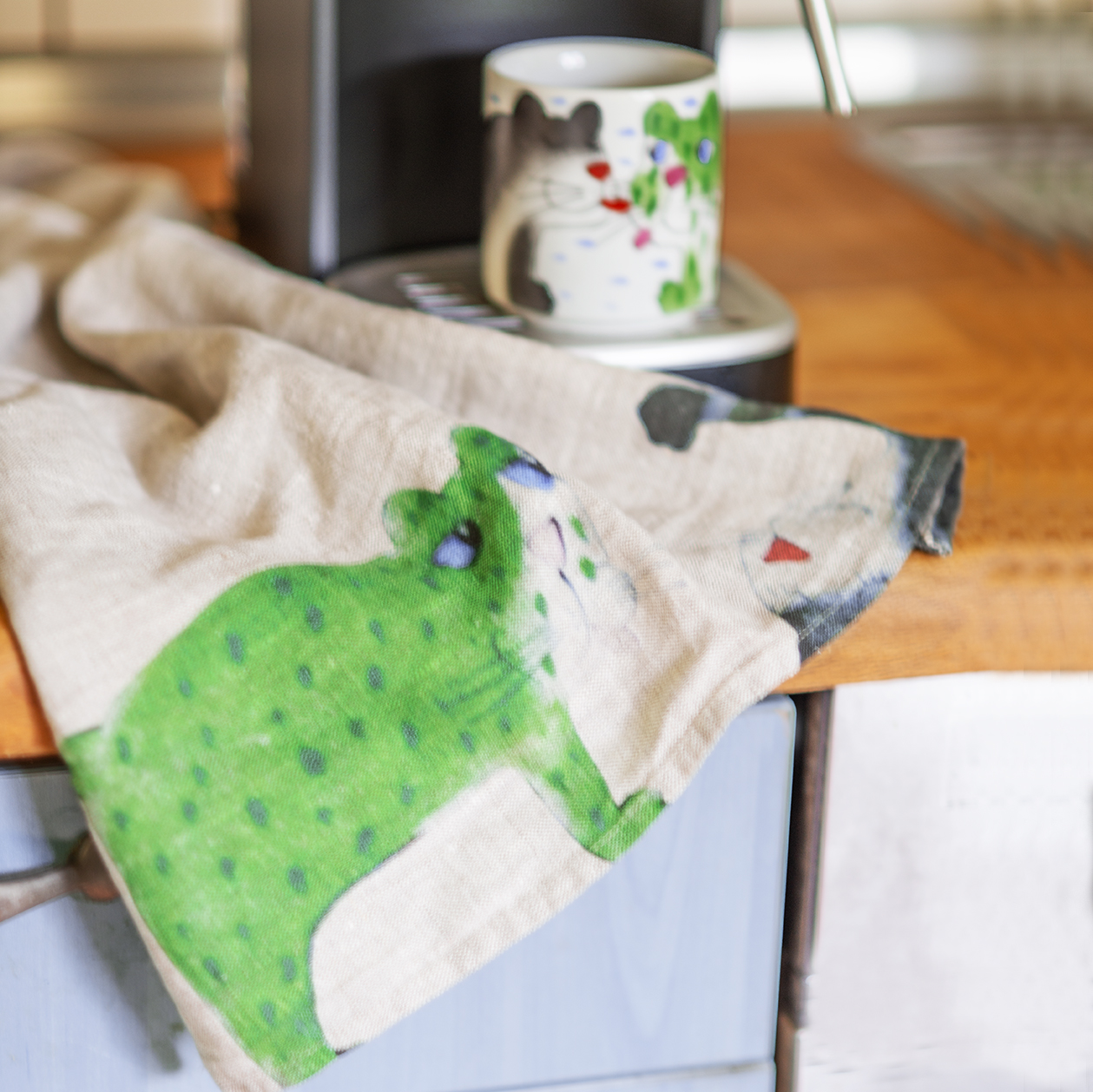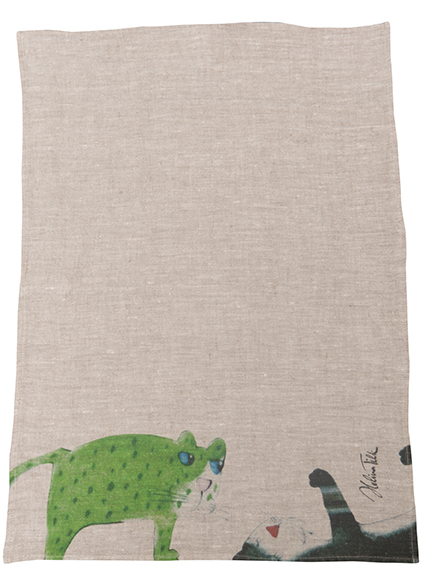 Helina Tilk: Geschirrtuch aus Leinen 70x50 Katze mit Tasse natur