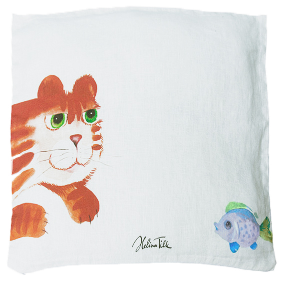 Produktinformationen "Helina Tilk: Kissenbezug aus Leinen Katze mit Fisch weiß"