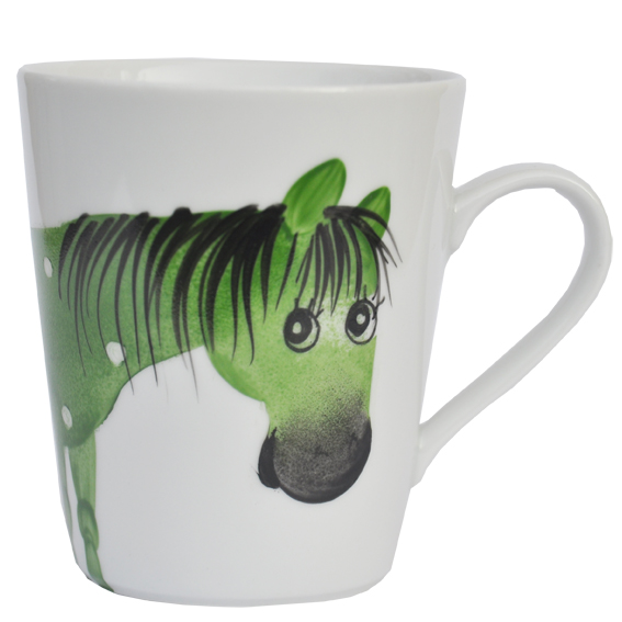 Handbemaltes Porzellan: handbemalter Henkelbecher 300 ml, Motiv: Osvald Pferd grün