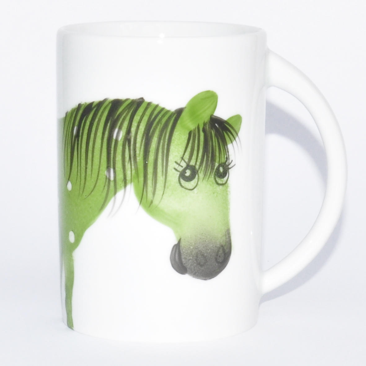 Handbemaltes Porzellan: handbemalter Henkelbecher, 300ml Motiv: Osvald Pferd grün