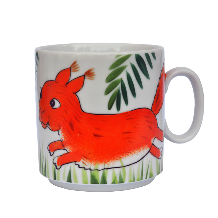 Porzellan Helina Tilk Deutschland: handbemalter Henkelbecher 300 ml, Motiv: Waldtiere Eichhörnchen