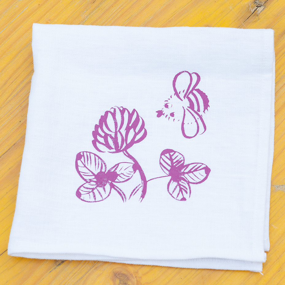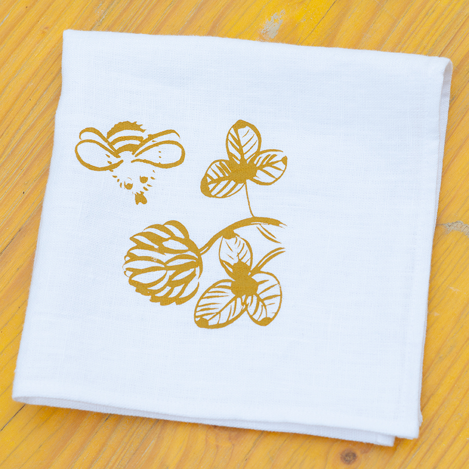 Serviette 40 x 40 Wiesenklee mit Biene, gelb. Stonewashed Leinen. Siebdruck. Preis: 2 St. 20,00 €