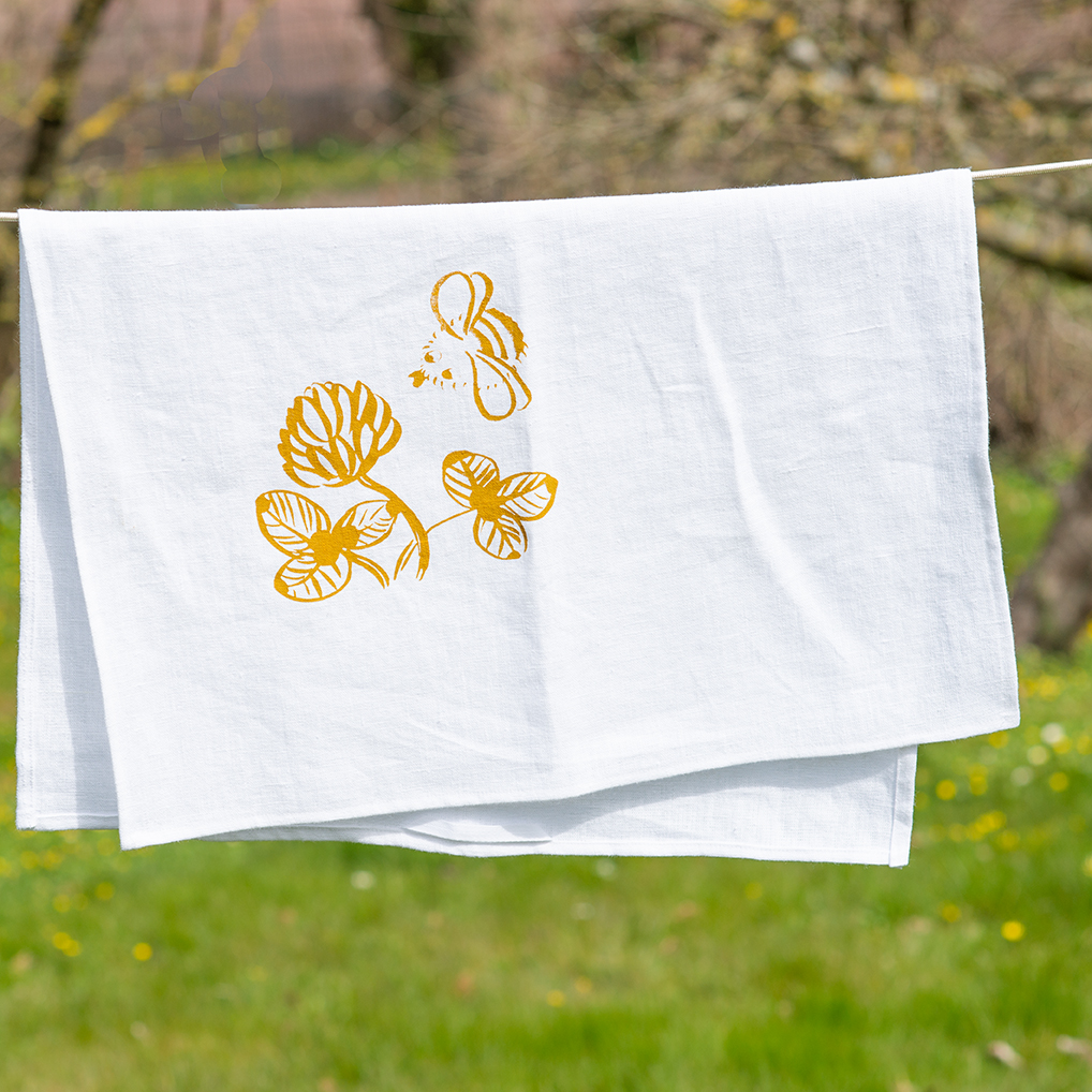 Handtuch 50 x 70 Wiesenklee mit Biene, gelb. Stonewashed Leinen. Siebdruck. Preis: 18,00 €