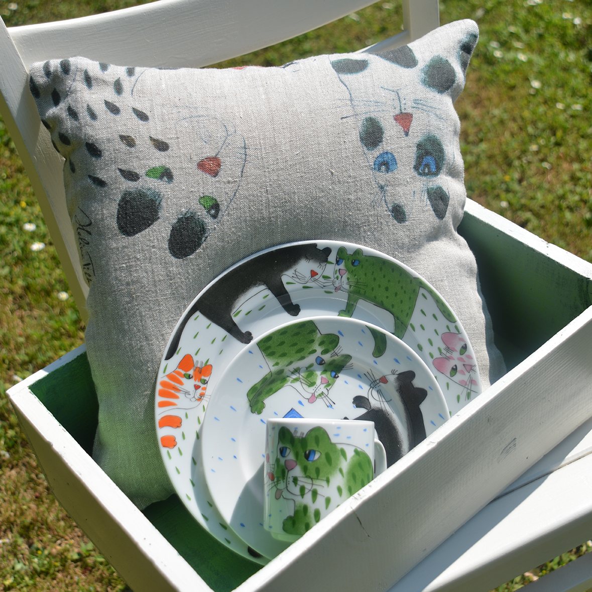 Die Serie „Bunte Katzen“ von Helina Tilk ist längst ein Klassiker bei Schulz HOMEWEAR. Die charmanten Katzenmotive erzählen sechs kleine Geschichten: von der Katze mit dem Marienkäfer, der Vogelkatze, der geheimnisvollen Mondkatze, der Katze mit Maus, der Katze mit der Milchtasse bis hin zu den zwei Kuschelkatzen – einmal grün, einmal schwarz.