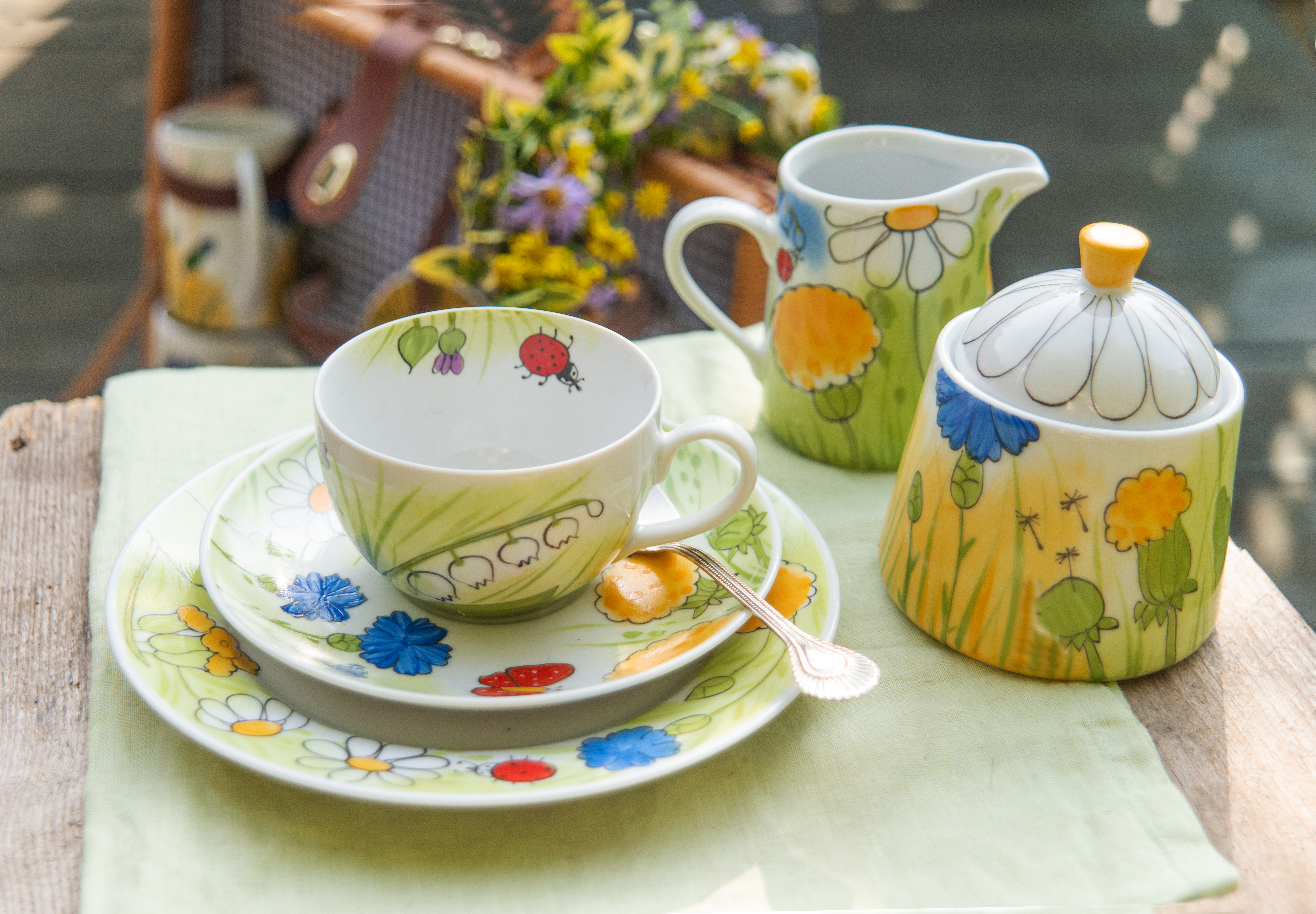 Es ist die Zeit des Lichts, des Lebens und der Farbe. Im Zentrum des Dekors stehen blaue Kornblumen und rote Schmetterlinge, die durch ihre Farbintensität bestechen. Das Service aus der Serie „Alle Blumen“ besteht aus einem großen Teller, einer großen Tasse samt Untertasse, einem Milchkännchen und einer Zuckerdose und lädt geradezu zum Picknicken ein. Besonderes Highlight ist die Butterdose mit zwei roten Schmetterlingen auf dem Deckel. Macht man sie auf, entdeckt man die zwei versteckten Butterblumen auf dem Boden. Dieser estnische Blumenzauber erfreut das Herz.